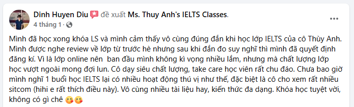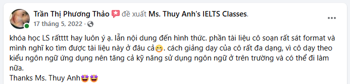 Hiện nay mình đang mở đa số lớp Online, nên đa phần feedback trên page là từ cựu học viên lớp Online. Đến giờ lớp vẫn nhận những phản hồi rất tích cực từ cả lớp Onl và Off, mình gửi bạn một vài feedback đại diện tham khảo. Bạn cũng có thể tìm hiểu thêm trên fanpage Ms. Thuy Anh’s IELTS Classes nhé.