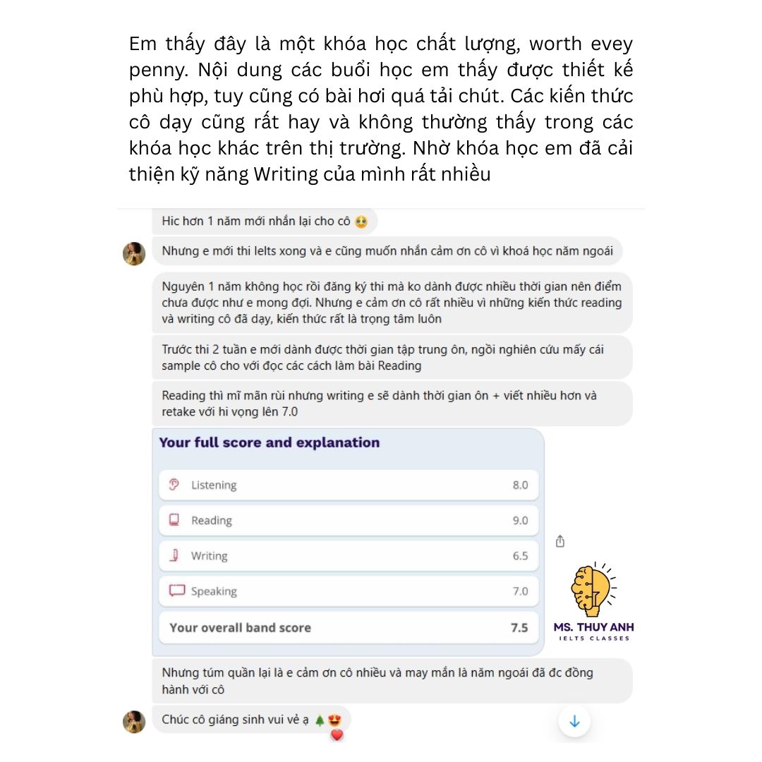 Mỗi một khoá cô Thuỳ Anh lại có một thiết kế và lộ trình riêng. Khoá Reading + Writing có rất nhiều phần kiến thức không chỉ về riêng bài thi IELTS mà còn cả về kiến thức về ngôn ngữ. Em ấn tượng nhất về cách mà cô chia chiến thuật cho từng dạng reading và từng loại ngôn ngữ cho Writing task 1. Đặc biệt là phần đọc báo trước khi viết Writing task 2, em rất hay bị bí ý tưởng và thiếu từ vựng, đọc báo giúp em cảm thấy việc viết Writing đỡ nản hơn ạ. Tài liệu của khoá thì rất nhiều luôn ạ, em thấy mỗi một tài liệu hay bài tập trong khoá đều được cô thiết kế và làm rất tỉ mỉ, cẩn thận, chắc hẳn mất rất nhiều thời gian, sau khoá thì em sẽ phải dành nhiều thời gian để xem lại hơn. Còn về cách giảng dạy của cô thì vẫn là 10 điểm không có nhưng.