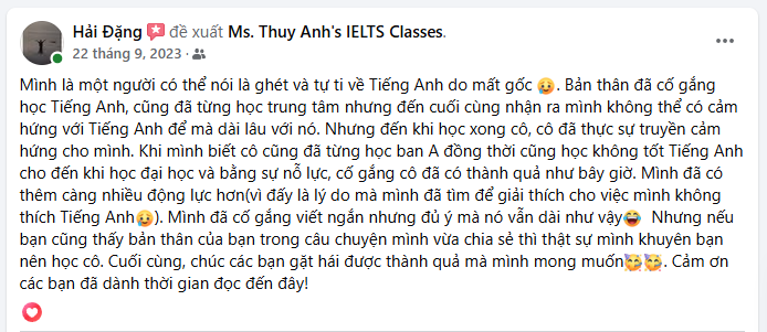 Khoá học cực kì cực kì xứng đáng với tiền và công sức bỏ ra, thực sự là tâm lý lần đầu tìm chỗ học IELTS cũng sợ là tốn tiền mà không hợp thì phí, nhưng học rồi thì chắc chắn chỉ có được thôi, cô giáo tâm huyết, chương trình dạy hay, sau khoá tự bản thân cảm thấy tiến bộ. Cảm giác rất may mắn khi tìm được chỗ học IELTS uy tín và có thể tin tưởng để học tiếp thế này.