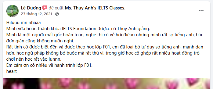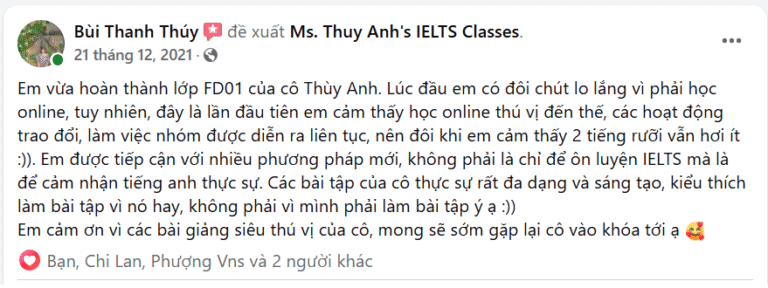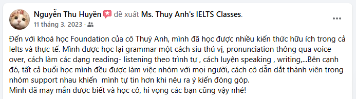Mình ấn tượng nhất với khóa học là nội dung chương trình học. Kiến thức lí thuyết được lồng ghép với các trò chơi, hoạt động nhóm, ví dụ minh họa đa dạng khiến việc học không hề nhàm chán. Cô Thùy Anh luôn luôn làm mới cách trình bày bài giảng, đa dạng các hoạt động trên lớp, ngay cả từng slide mỗi buổi học đều được trình bày bằng màu sắc, phong cách khác nhau đủ thấy cô chăm chút cho mỗi bài giảng như thế nào, cũng khiến mình hứng thú hơn trong mỗi giờ lên lớp. Việc học tập, kiểm tra và ôn tập thường xuyên theo chương trình học khiến mình dễ nhớ bài hơn. Lớp học có cô giảng dạy nhiệt tình, kiên nhẫn, tâm huyết, với chương trình học thiết kế rất hợp lý về cả thời gian, nội dung khiến mình cảm thấy khóa học rất hiệu quả đối với mình. Đây là lần thứ 2 mình học lớp Foundation IELTS, lớp trước cách đây gần 4 năm của 1 thầy khác. Để so sánh, lớp học này thực sự chất lượng, mình rất hài lòng về khóa học này.