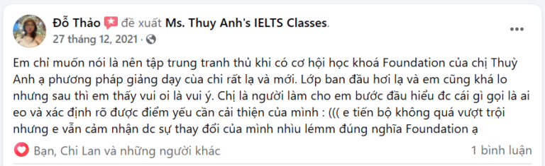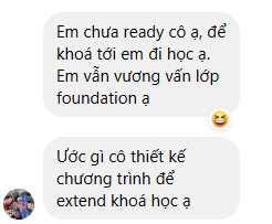 Trường hợp đặc biệt: Một bạn học viên của mình đã học xong lớp chuyên sâu Listening-Speaking, trình độ khoảng 6.0 rồi, vậy mà vẫn đăng ký học thêm Foundation chỉ vì yêu thích. Sau khi học xong mình nhắn hỏi có định học tiếp lớp RW luôn không thì bạn bảo vẫn còn vương vấn Foundation ^^ Trên lớp, bạn cũng từng chia sẻ là vẫn học được nhiều từ Foundation, có lẽ vì chương trình được mở rộng từ cái cơ bản nên vẫn rất có ích cho cả những bạn 6.0–6.5 muốn củng cố lại nền tảng.